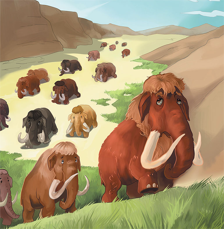 Той далекой весной наши герои, после длительного перехода, добрались до места, которое мы сейчас называем полуостровом Ямал. Здесь, на берегу бесчисленных рек, было изобилие высоких трав и кустарника, так необходимых этим великанам.