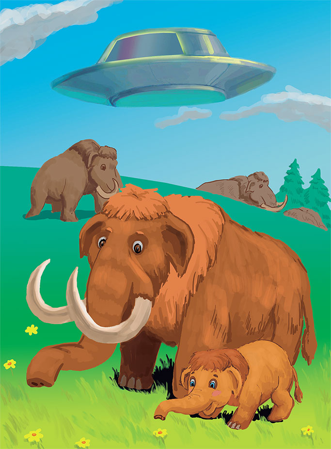 Но больше всего мамонтенку нравилось наблюдать за непонятными существами, летающими на каких-то серебристых дисках. Иногда они зависали над мамонтенком, улыбались и махали ему руками, а потом на огромной скорости уносились ввысь. Она могла часами стоять и ждать их появления.