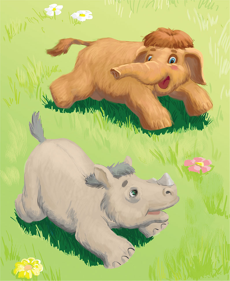 На следующий день мамонтенок был уже бодр и вместе со своими новыми друзьями весело бегал по поляне.