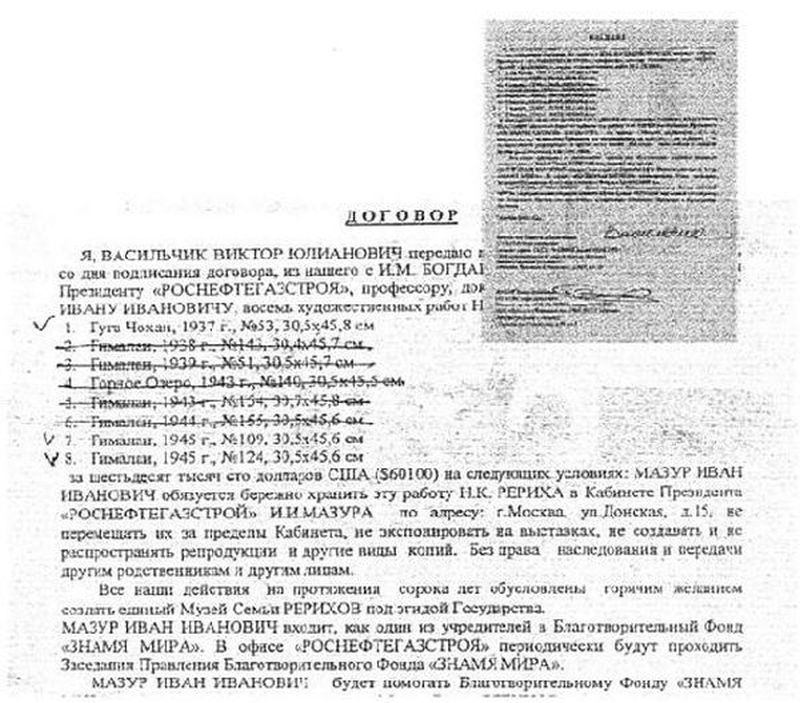 Всего же, по некоторым сведениям, за определенный период из наследия Рериха ушло как минимум 30 картин стоимостью приблизительно полмиллиона долларов. Восемь из них должны были украшать кабинет президента «Роснефтегазстроя» И. И. Мазура, и, судя по всему, большого любителя живописи[119].