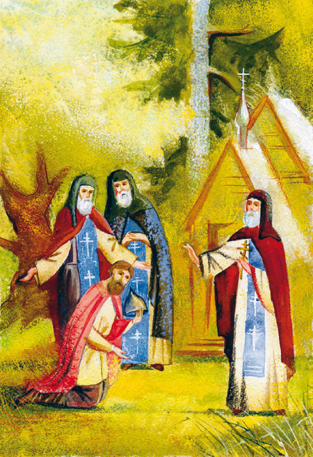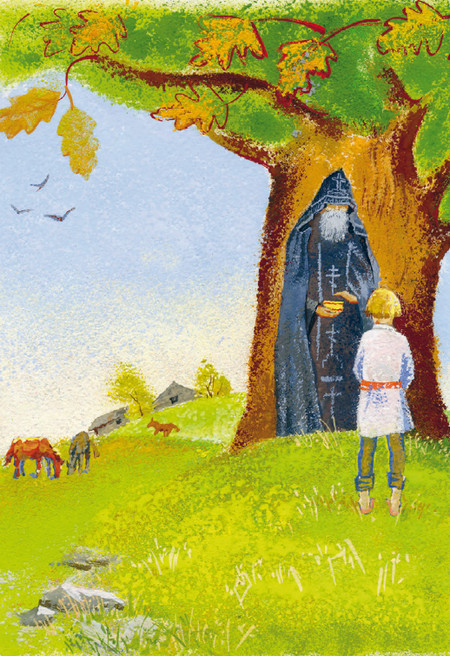Вдруг смотрит, на пригорке, под дубом, – старик в монашеском одеянии. Стоит один-одинёшенек и Богу молится. «Не иначе, это святой человек, угодник Божий, – подумал Варфоломей. – Попрошу-ка я его и за меня помолиться, чтоб далась мне наконец книжная грамота». Встал он поодаль и начал ждать. Старец закончил свою молитву, увидал мальчика, подозвал его к себе и спросил, чего ему нужно. Тут Варфоломей вдруг заплакал и стал рассказывать о всех своих горестях. Монах выслушал его, улыбнулся и сказал коротко: «Давай вместе помолимся, чтобы Господь дал тебе книжное разумение». А когда они помолились, достал из-за пазухи коробочку, а из неё вынул кусочек просфоры – церковного хлебца – и дал мальчику: