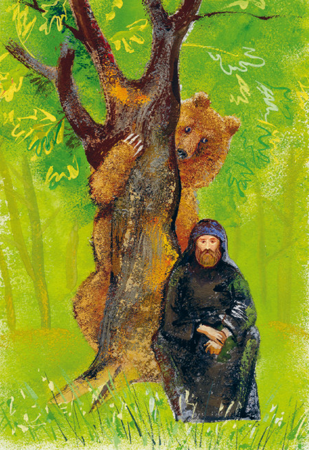 Однажды весной преподобный Сергий увидел перед своей хижиной большого медведя, оголодавшего после зимней спячки. Правда вид у мишки был совсем не свирепый: исхудал, мех висит клоками. Встал перед кельей и рычит жалобно, будто поесть просит. Сжалился монах над зверем: взял кусок хлеба, вышел и отдал медведю свой обед. Ведь кроме хлеба, который ему иногда приносил младший брат, у преподобного Сергия не было другой еды. Медведь съел хлеб и ушёл в лес. И потом стал время от времени приходить к святому в гости – отведать монашеского хлеба. А тот лишь благодарил Бога за такого необычного соседа, посланного ему в утешение.