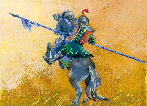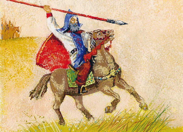 Тогда-то и закипела битва, заблестели мечи острые, как молнии, затрещали копья, полилась кровь богатырская под сёдла, покатились шлемы золочёные под ноги конские, а за шлемами и головы богатырские…