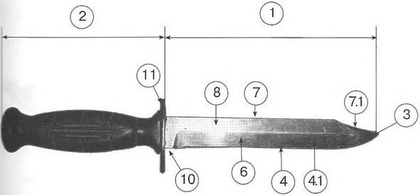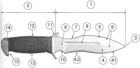 Устройство боевого ножа строго регламентировано. Любое отклонение от стандарта позволяет классифицировать практически любой нож как охотничий, разделочный, туристический и т. д.