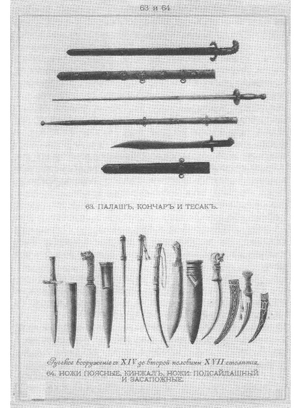 По мнению специалистов, в том числе и создателя первого русского авто- мата оружейника Федорова, первый том работы Висковатова А. В. в части «доисторической Руси» «…должен быть признан исключительно плодом фантазии».17 Это утверждение можно также отнести к изображению классических русских ножей – подсайдашных, засапожных и кинжалов. Тем, кто хотя бы поверхностно знаком с оружием Востока вообще и Ближнего Востока в частности, очевидно, что эти образцы именно оттуда и русским приписывались безосновательно. Все это никакого отношения к реальности не имеет. Зато как красиво и поэтично. Хотя это всего лишь плод художественной фантазии рисовальщика и исторического вымысла. Об этом же свидетельствует и археология.
