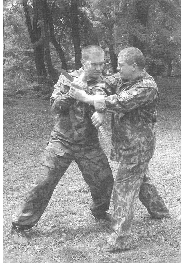 Подобный хват (фото 1) обеспечивает возможности нанесения режущих ударов и колющего удара вперед, или (фото 2) колющего удара сверху-вниз, или режущего возвратно-поступательного удара.