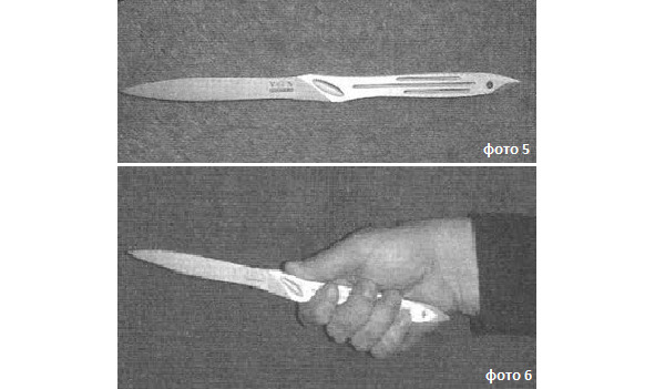 Варианты хвата ножа определяются в том числе и в зависимости от использования ставших модными современных ножей, выпускаемых вообще без рукоятки (фото 5, 6).