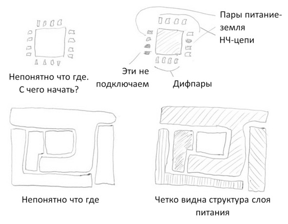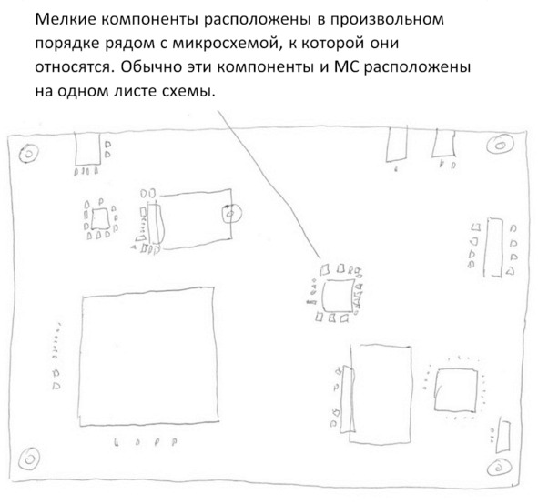 Крупные микросхемы и разъемы расположить примерно так, как они должны быть. Мелочь расположить группами рядом с соответствующими крупными микросхемами. Внутри групп расположение мелких компонентов произвольное, должна быть ясна только занимаемая ими площадь. Задача – определить взаимное расположение компонентов и как все будет умещаться.