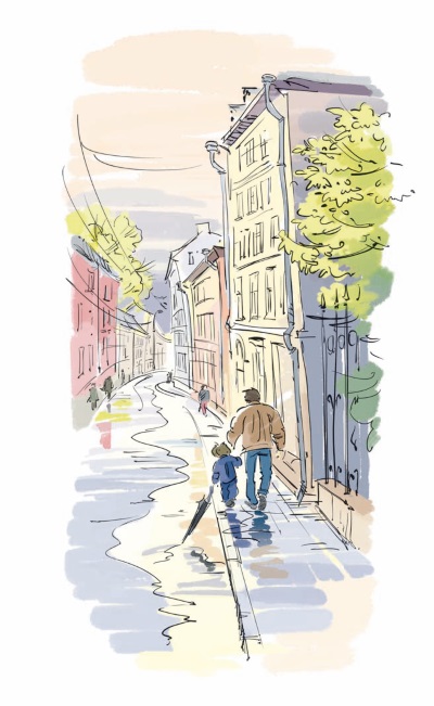 Теперь Антошка увидел, как после грозы небо снова стало синим, выглянуло солнце и как они с папой, промокшие, немного озябшие, но и счастливые едут домой. Над деревьями, над крышами высоко в небе висит радуга. Папа оглядывается на Антошку, весело что-то кричит, а потом разгоняется и въезжает в самую большую лужу – и брызги окатывают его с ног до головы, а он смеётся. Антошка вслед за папой тоже въезжает в лужу. На миг становится страшно, потому что где-то на середине ему вдруг кажется, что это не лужа на дороге, а большой пруд и он, Антошка, едет не по асфальту, а по воде и сейчас ухнет глубоко вниз, на самое дно.