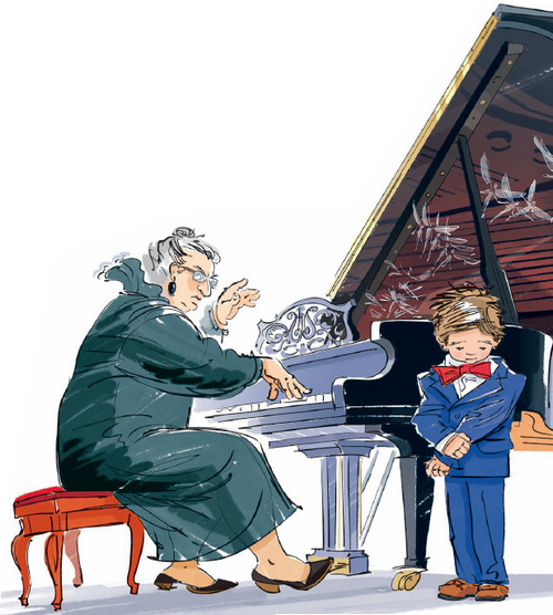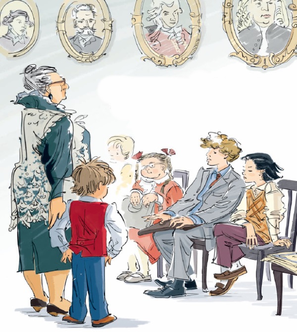 В небольшом зале было много преподавателей. Они расположились за столом. Антошка огляделся. На стенах висели портреты – только мужчины. А у рояля ожидала пожилая строгая дама в чёрном платье. Седые, почти белые её волосы были собраны на затылке в пучок, а на носу сидели очки с толстыми стёклами.