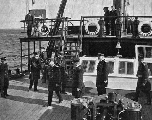 Император Николай II на крейсере «Светлана» во время смотра 26 сентября 1904 года в Ревеле. Слева направо: управляющий Морским министерством вице-адмирал Ф. К. Авелан, военный министр генерал-лейтенант В. В. Сахаров, император Николай II, генерал-адмирал великий князь Алексей Александрович, контр-адмирал З. П. Рожественский, командир «Светланы» капитан 1 ранга С. П. Шеин, министр императорского двора барон Б. В. Фредерикс