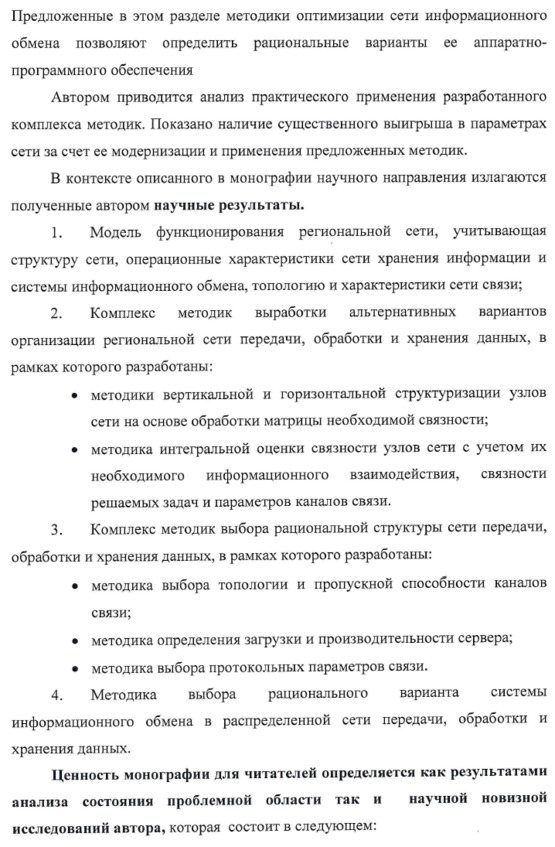 Несомненно, монография имеет достаточно весомое научное значение, соответствует требованиям к издаваемым монографиям (научным изданиям) ВАК и будет интересна для специалистов работающих в области информационных технологий, инженеров и ученых занимающихся проблемами исследования и проектирования распределенных вычислительных систем и сетей передачи данных, а также будущим аспирантам, работающим по научным специальностям 2.3. «Информационные технологии и телекоммуникации» и 2.2.15. Системы, сети и устройства телекоммуникаций.