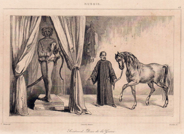 В томе, посвященном России, между 73 и 74 страницами, я нашел очень интересную иллюстрацию славянского бога Святовита и человека, который преподносит ему в дар коня2.