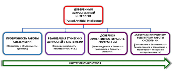 Доверенный искусственный интеллект (Trusted artificial intelligence system, Responsible Artificial Intelligence) – это система, обеспечивающая выполнение возложенных на нее задач с учетом ряда дополнительных требований и/или ограничений, обеспечивающих доверие к результатам ее работы. Также системой доверенного искусственного интеллекта называют прикладную систему искусственного интеллекта, обеспечивающую выполнение возложенных на нее задач с учетом ряда дополнительных требований, учитывающих этические аспекты применения искусственного интеллекта, которая обеспечивает доверие к результатам ее работы, которые, в свою очередь, включают в себя: достоверность (надежность) и интерпретируемость выводов и предлагаемых решений, полученных с помощью системы и проверенных на верифицированных тестовых примерах; безопасность как с точки зрения невозможности причинения вреда пользователям системы на протяжении всего жизненного цикла системы, так и с точки зрения защиты от взлома, несанкционированного доступа и других негативных внешних воздействий, приватность и верифицируемость данных, с которыми работают алгоритмы искусственного интеллекта, включая разграничение доступа и другие связанные с этим вопросы.