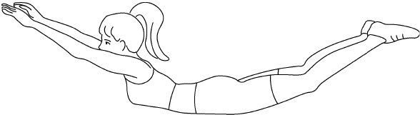 2. Обратная «лодочка»1. Лечь на живот. Руки вытянуты вперед. Ладони направлены вниз. Ноги прямые, носки вытянутые.