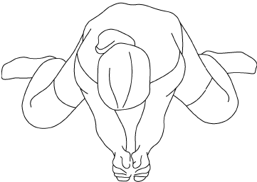 4. Втянуть живот так, чтобы спина выгнулась дугой вверх, голову опустить. Мышцы пресса в этом положении напряжены, а спина растягивается вверх как можно выше. Втянуть прямую кишку.