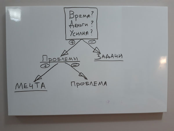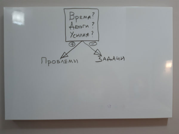 – Вот если нужно что-то сделать, но не понятно сколько на это уйдёт времени, денег, личной энергии – тогда это проблема. А вот если, знаешь примерно про сроки, и деньги не фантастические понадобятся, и вроде бы по силам – тогда это задача! Даже если много денег надо, или времени – год или несколько, всё равно – задача, большая, но задача. Если вот таким образом прикинуть – у вас чего больше: проблем или задач?
