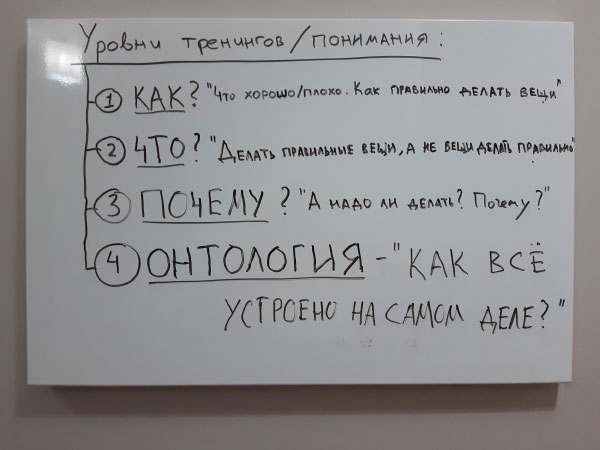 Консультант: Ну так вот… три уровня: “КАК”, “ЧТО” и “ПОЧЕМУ”. Но я определил ещё один – высший уровень зрелости, четвёртый – ОНТОЛОГИЯ. Это поиски ответов на вопрос – как всё устроено на самом деле. Вот мы же, например, не задаёмся вопросом – почему бы не сделать шаг с крыши 15-ти этажного дома? Как бы всё понятно: сделаешь шаг – полетишь вниз и разобьёшься насмерть. Так устроен физический мир. Поэтому я уверен – разобравшись с онтологией, можно очень легко ответить на все предыдущие вопросы – ПОЧЕМУ? ЧТО? КАК? А значит, это может помочь любому человеку в любой области. Хотя по масштабам это уже выглядит совсем как наука. А если ответы даются только на первых трёх уровнях, на первых двух или, вообще – только на вопрос “КАК?” – это точно методология!