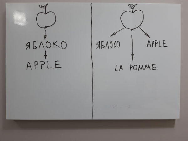 Писатель: Главный вопрос – а что там у нас в мозгу лишнее? Возвращаясь к языку. Мы с женой с годовалого возраста сына учили сразу трём языкам – английскому, французскому и русскому, конечно. Курсы для малышей, репетиторы. Первые слова он начал говорить на английском. Видимо, потому что слова короче – “кэт” (англ: cat), “дог” (англ: dog) проще выговорить, чем “кошка” или “собака”. Идея развивать ребёнка через изучение разных языков с самого детства принадлежала жене, а я поначалу присматривался, но потом понял, что никакой перегрузки нет, языки учатся играючи – и успокоился. Интересно, что при разговоре, сын свободно переходит с одного языка на другой, никогда их не перемешивает. Если я вижу предмет, например, яблоко, то у меня в голове появляется русское слово “яблоко”, которое я могу “перевести” там же в голове на “эппл” (англ: apple). Именно так, как мы языки и учили – переводом. А сын яблоко увидел в первый раз, когда никакого названия не знал, он просто вкусный предмет видел. Слышал три разных названия и запомнил. То есть у меня в голове “предмет – слово 1 – потом слово 2”, а у него в мозгу сразу все связи зажигаются “предмет – слово 1”, “предмет – слово 2”, “предмет – слово 3”. Это как у нас “предмет: яблоко = яблочко”, у него “предмет: яблоко = эппл = ля пом” (англ: apple, фр: la pomme).