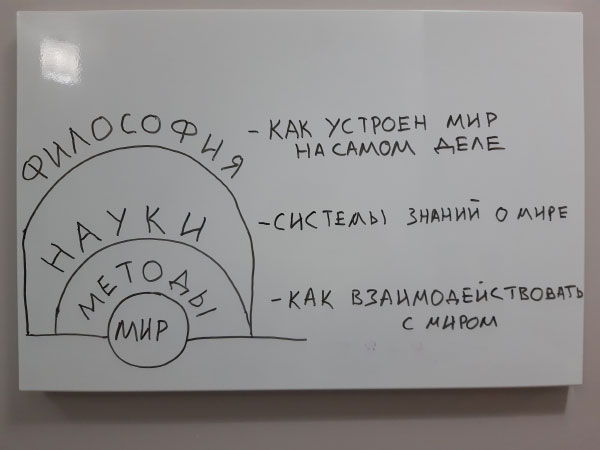 Инженер: Позвольте не согласиться с тем, что изображено на доске. Я бы всё разделил на известное и неизвестное. Знания и веру отнесём к известному и выделим в каждой области по две подобласти: со знаком плюс и со знаком минус, вот так: