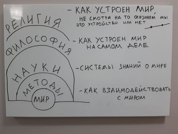 Писатель: Фило-софия – с греческого – это любовь к мудрости. Но, если мы говорим о действительном вопрошании об устройстве мира, то религия появилась раньше. Появилась и развивалась. От ответов на вопросы “почему гремит гром” и “почему дует ветер”, до монотеистических религий современности. При этом я считаю глубочайшим заблуждением, когда сразу скатываются к вопросу “Кто устроил мир?”, и спорят, есть ли “Он”. От этого все проблемы. Религия отвечает именно на вопрос “Как устроен Мир” и “Каково место человека в Мире?”. Само слово религия – ре-лигаре (re-ligare) с греческого – воссоединение, соединение заново того, что и так соединено. Возьмите две точки в пространстве. Сколько через них проходит прямых? Одна. Единственная. И когда мы рисуем эту линию, или описываем это законами в науке, происходит соединение в нашем сознании двух точек, которые и так соединены, без нас с вами. В этом смысле, философия, которая лучше всех остальных описывает Мир, приближается к понятию “религия”.