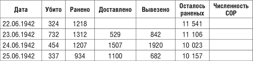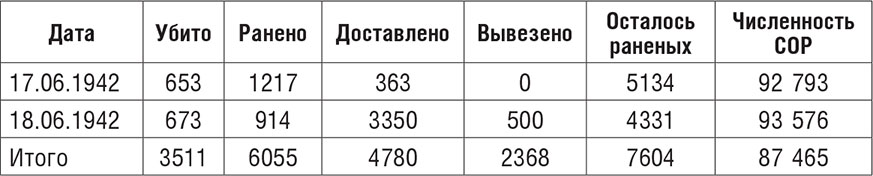 С начала штурма до 28 июня 1942 года (дата, до которой еще велся учет потерь) убитыми защитники потеряли 12 тыс. человек, ранеными – около 25 тыс. Данные сводок никак не стыкуются с официальными цифрами по Приморской армии в послевоенном статистическом сборнике: 5049 человек убитыми и 20 112 ранеными. Причин две: это цифры по армии (без флотских частей), и вторая причина – цифры все же занижены, так как в сборнике приводятся данные только по тем бойцам, гибель которых подтверждена. Но цифра численности СОР становится все более условной. Она не учитывает потери пленными.