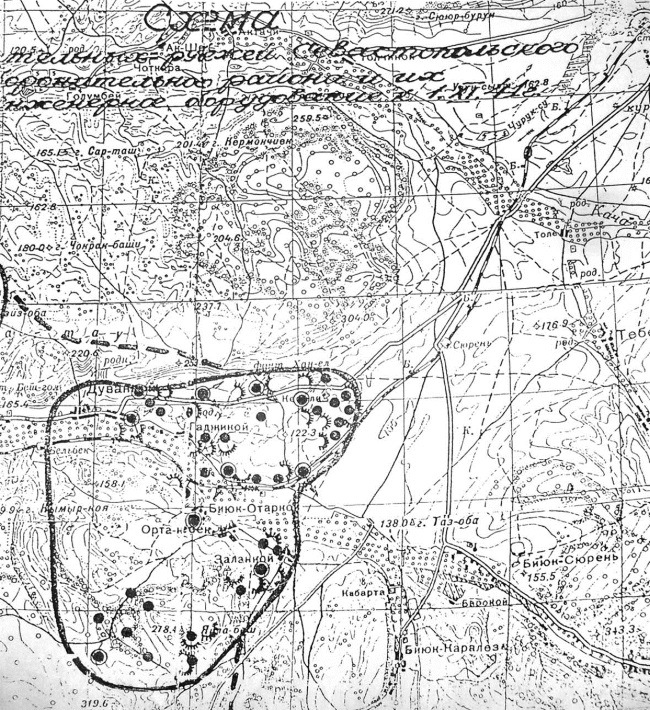 По мере того как ситуация менялась, менялся поход к строительству рубежей. Всего вокруг города велось строительство четырех оборонительных рубежей: Дальний (Альминский) на расстоянии 30–40 км от города; Передовой – 20–25 км от города; Главный – 10–15 км от города; Тыловой (противодесантный или противотанковый) – 5 км от города.[42]