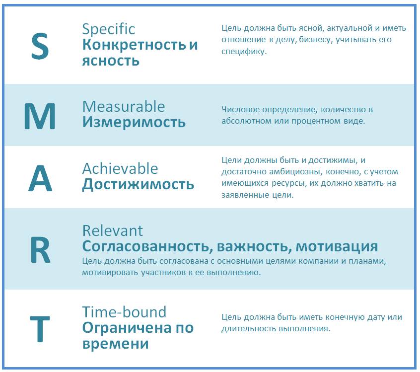 В современном бизнесе цикл менеджмента должен обеспечить передачу информации между людьми так, чтобы она была понятна, не искажалась и не терялась при передаче. Чтобы достичь этих целей, применяется постановка задач по определенным правилам. Одно из таких распространенных стандартных правил – SMART (расшифровка ниже). Это аббревиатура из английских букв, каждой из которых соответствует одно из требований оценки цели: