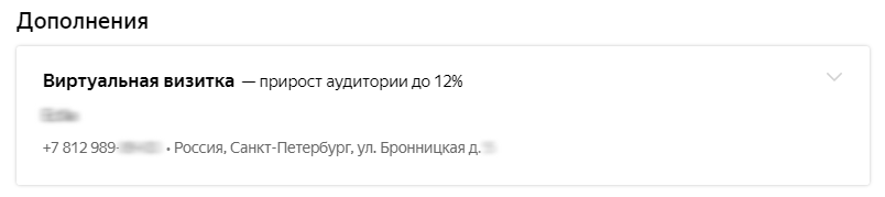 «Виртуальная визитка» – аналог пункта «Контакты организации» и в объявлении отображается что-то одно, поэтому нужно выбрать, что будете заполнять. «Виртуальную визитку» мы уже рассматривали подробнее в общих настройках сразу для всей рекламной кампании. Помимо общей виртуальной визитки сразу для всех объявлений, можно задавать индивидуальные контакты для каждого объявления в отдельности. Поэтому заполняем это поле только, если в общих настройках вы не заполнили «Виртуальную визитку» сразу для всей кампании до того, как начали создавать объявления. Подробную информацию, как заполнять «Виртуальную визитку» можно посмотреть в общих настройках кампании.