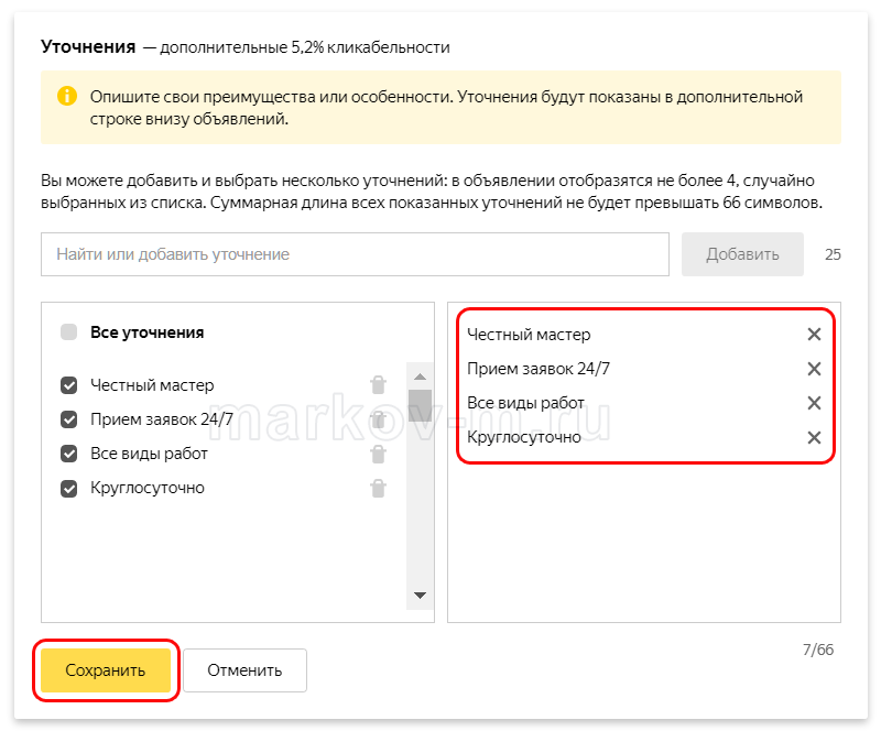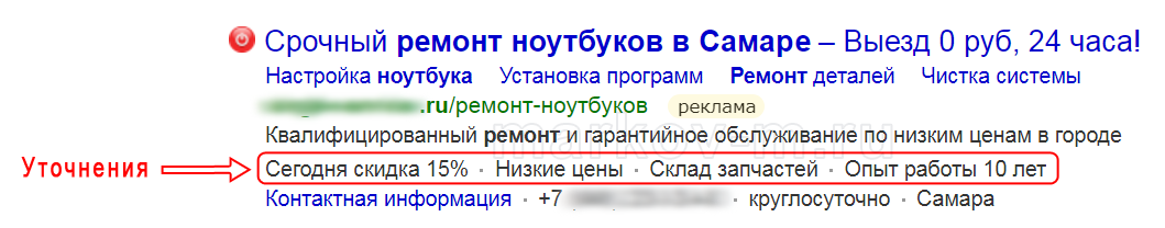 Уточнения – короткие фразы, показывающиеся под основным текстом объявления. Визуально уточнения имеют такой же стиль как текст, поэтому могут восприниматься пользователями как продолжение текста. Учитывая, что в тексте объявления лучше указывать наиболее важные преимущества вначале, а менее значимые в конце, то в уточнениях можно продолжить писать оставшиеся менее значимые преимущества, которые не уместились в тексте объявления.