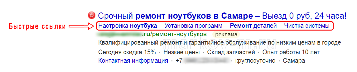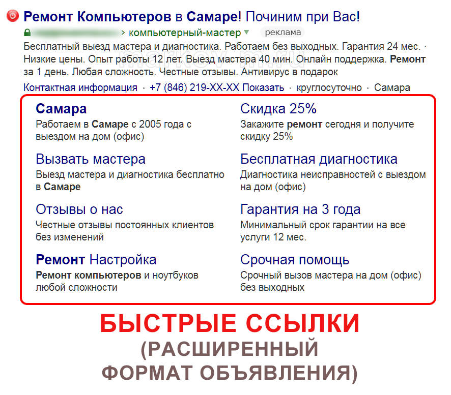 Дополнительные ссылки дают возможность посетителю быстрее попасть в интересующий его раздел, а чем проще найти информацию, тем больше шансов на заявку или звонок. Также быстрые ссылки визуально увеличивают размер вашего объявления, делая его более заметным.