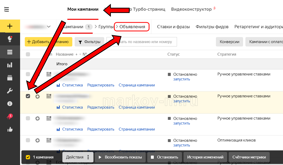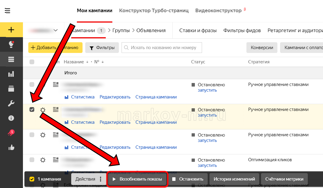 Чтобы запустить необходимо отметить «кампанию»(«группы» или «объявления») и далее кликнуть возобновить показы.