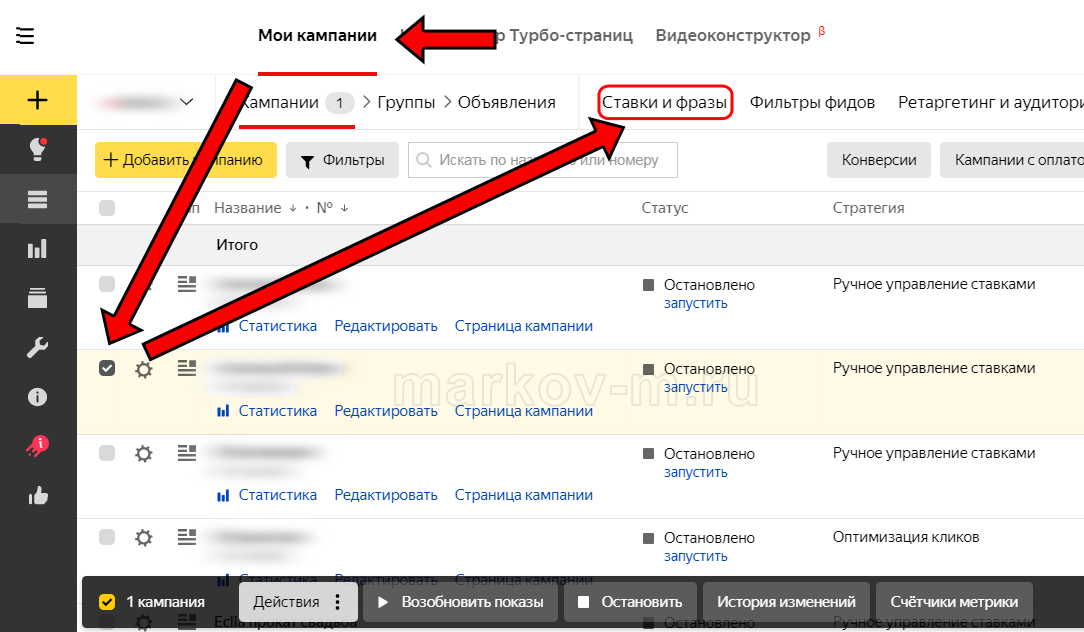 Для изменения ставок переходим по ссылке «Мои кампании» -> выделяем необходимую кампанию -> кликаем «Ставки и фразы».