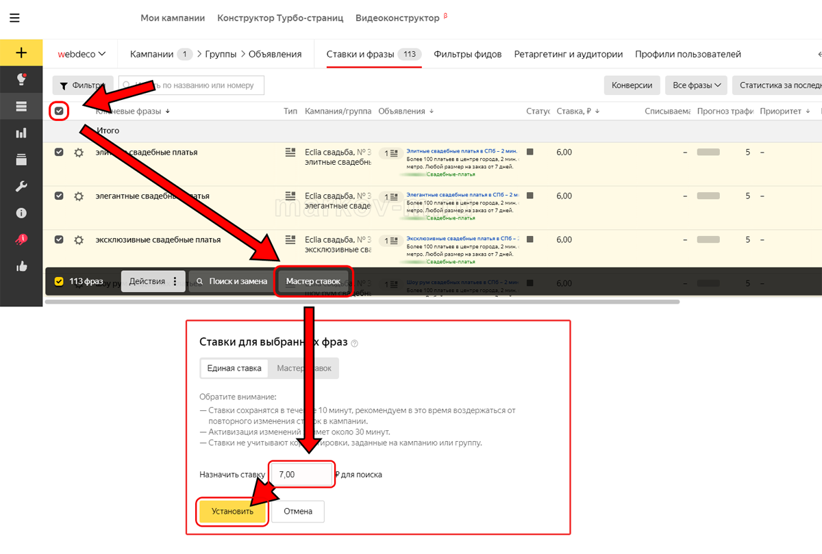 1. Если вы выбрали ручную стратегию. Отмечаем фразы, для которых необходимо изменить ставки, для выделения всех фраз можно кликнуть на общем поле(находится выше остальных) -> Нажимаем «Мастер ставок» -> в появившемся окне, выбираем сверху пункт «Единая ставка» и пишем ставку -> «Установить». Менять ставки желательно не реже, чем раз в 2-4 дня, но в начале запуска(пока вы еще в поиске оптимальных значений) не реже, чем несколько раз в день.