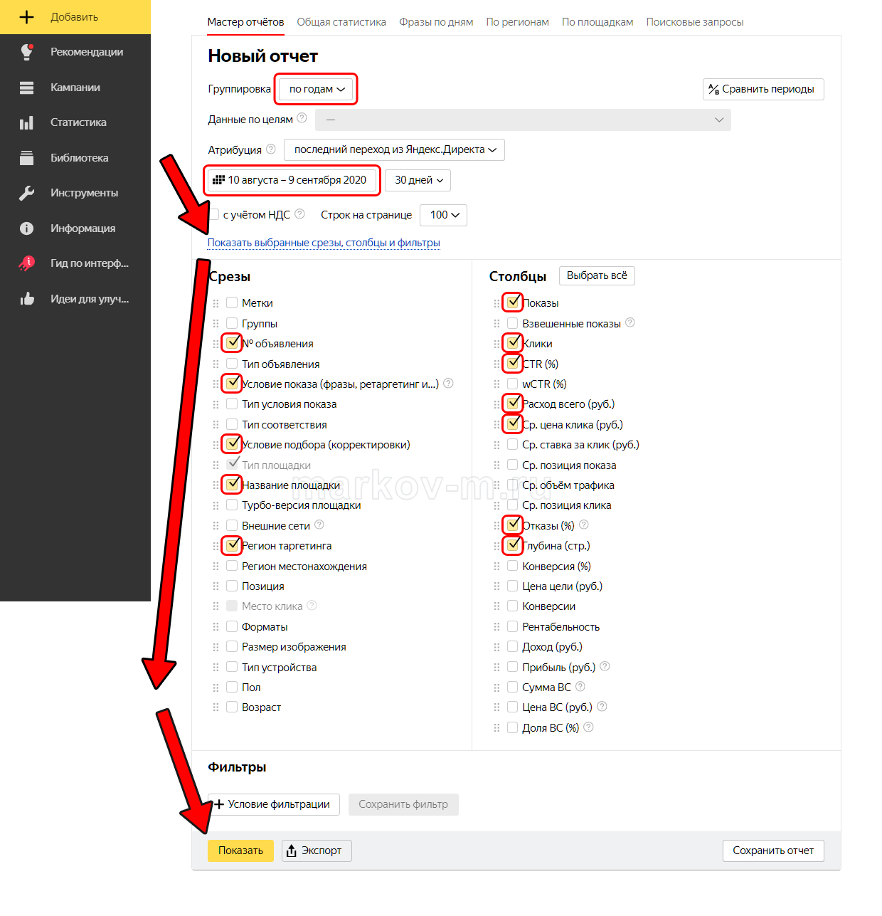 – Кликаем по ссылке «Показать выбранные срезы, столбцы и фильтры» и в появившемся меню отмечаем в «Срезах»: «№ объявления», «Условие показа (фразы, ретаргетинг и…)», «Условие подбора (корректировки)», «Название площадки», «Регион таргетинга». В «столбцах» выбираем: «Показы», «Клики», «CTR (%)», «Расход всего (руб.)», «Ср. цена клика (руб.)», «Отказы (%)», «Глубина (стр.)»;
