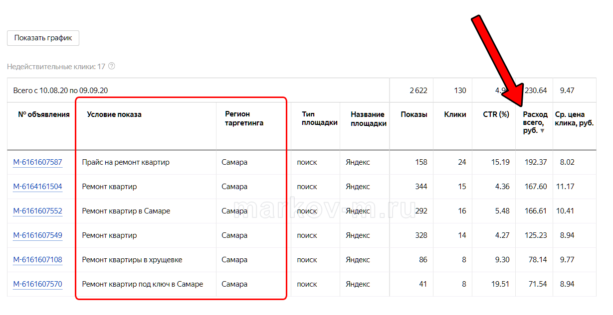 Далее появится таблица, в которой вначале необходимо отсортировать результаты по столбцу: «Расход всего», чтобы наиболее значимые строки с высоким расходом оказались сверху. Далее смотрим на основные столбцы: «Условие показа» и «Регион таргетинга», чтобы убедиться, что реклама показывается по заданным фразам и в нужном регионе. При необходимости корректируем регион и фразы в настройках «группы», также можете посмотреть остальные столбцы.