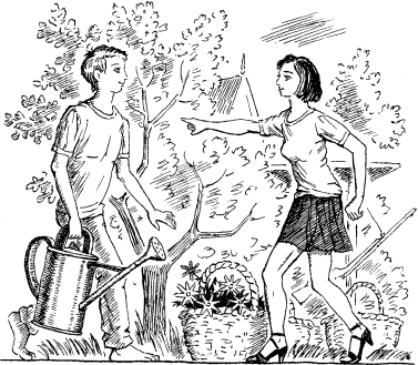 Таня. Пионы, гладиолусы… (Подходит к клумбам.) А это что?