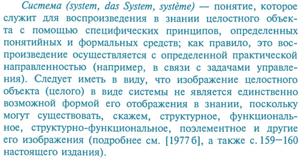 «Система – это понятие формализованного научного отображения и описания естественных объектов, обладающих целостностью того или иного вида со свойствами существенно отличными от свойств составляющих ее элементов и, соответственно, научного описания искусственно создаваемых объектов с использованием принципов естественной организации целостностей, живых целостностей».