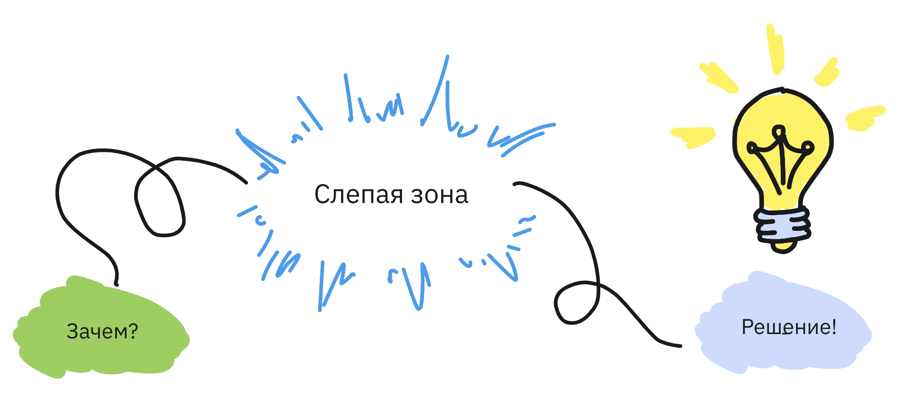 В спешке между проблемой и идеей возникает слепая зона. Цепочка рассуждений и выводов остаётся за кадром (рис. 1).