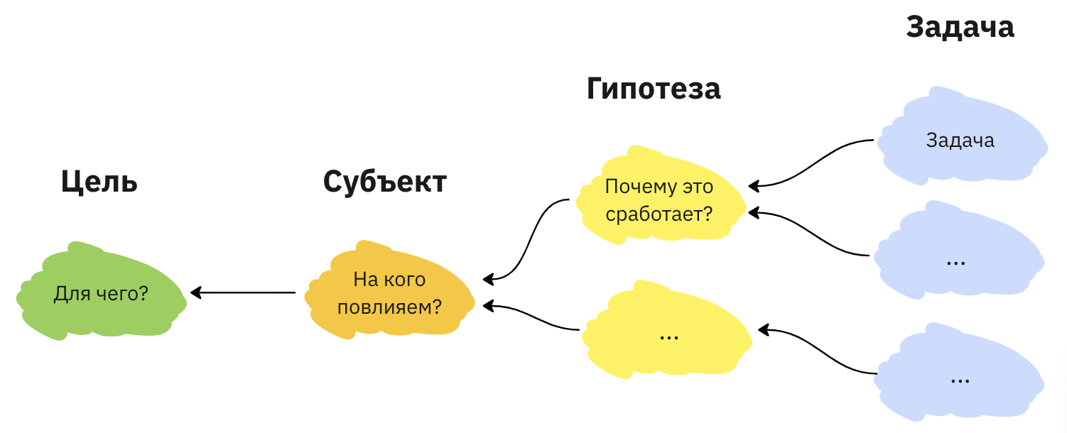 3. Гипотеза – формализованная идея, с помощью которой мы собираемся изменить поведение субъекта. На этом уровне мы описываем ключевые идеи нашего продукта – то, что в итоге поможет нам дойти до цели.
