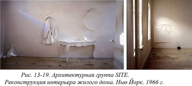 Наглядный пример подобного восстановления связи с прошлым дизайнерскими средствами был продемонстрирован при модернизация одной из квартир в Нью Йорке. Дом был построен в 1820-х годах в историческом районе города. В интерьере сделаны на первый взгляд странные дизайнерские приемы, отталкивающиеся от истории дома. Так, в некоторых местах на стенах сделаны барельефы, копирующие фрагменты мебели, когда-то стоявшей в этой квартире (Рис. 13–19).
