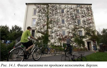 Считается, что сначала люди обменивались информацией с помощью жестов. И лишь потом появилось слово. Таким архитектурным информационным жестом можно считать оформление фасада одного из магазинов в Берлине. Недолго думая хозяин магазина попросту развесил по фасаду велосипеды. И всем стало понятно, что здесь торгуют велосипедами. (Рис. 14–01).