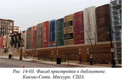 Аналогичным информационным жестом стал фасад пристройки к библиотеке в американском Канзас Сити (Рис. 14–03).