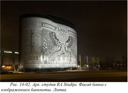 Решение не слишком профессиональное, однако информационности ему не отказать. Но и дизайнеры-профессионалы порой не гнушаются «информационных жестов». Именно так можно охарактеризовать фасад здания одного из литовских банков в виде гигантской банкноты, обернутой вокруг здания (Рис. 14–02).