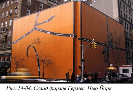Архитектурно-информационным жестом, тоже откровенно прямолинейным, можно также считать склад фирмы Гермес в Нью Йорке, сделанный в форме гипертрофированно увеличенной упаковочной коробки (Рис. 14–04). И ясно, что склад, и название фирмы Гермес хорошо прочитывается.