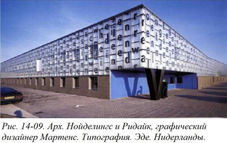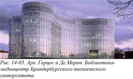 В большинстве случаев разработку архитектурной одежды выполняет сам архитектор данного здания. Так, в построенном по проекту швейцарских архитекторов Герцога и де Мерона библиотечно-медийном центре Бранденбургского технического университета два слоя стеклянного фасада покрыты узором в виде букв различных алфавитов и шрифтов (Рис. 14–05).