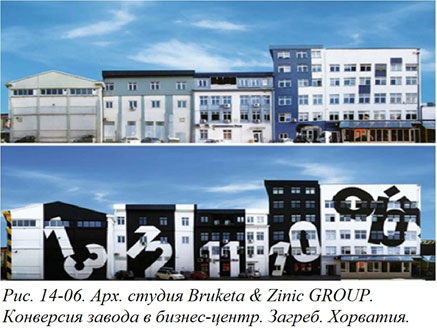 Уже можно встретить людей, тело которых почти полностью буйно покрыто татуировкой. Точно так же имеются аналогичные достаточно примитивные попытки «приукрасить» тело вполне заурядной по форме архитектуры. Татуировка (если ее не отрицать в корне) как и всё требует профессионализма. Более профессиональный, более простой и, тем не менее, довольно эффективный метод архитектурной татуировки был использован при преобразовании фасадов бывших заводских корпусов в Загребе по проекту архитектурной студии «Bruketa & Zinic» (Рис. 14–06). Цифры на фасадах – не просто декоративные пятна. Они соответствуют нумерации корпусов комплекса, тем самым служа и информационным задачам.
