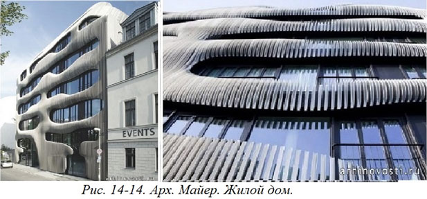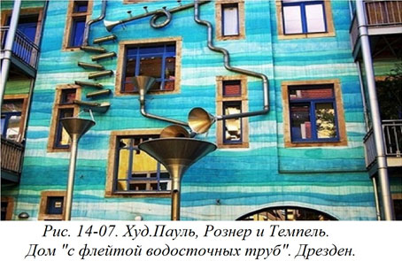 Эту работу также можно отнести к архитектурной татуировке, причем явно профессиональной. А профессионализм способствует усложнению и «утончению» предлагаемых решений. Пример тому – фасад жилого здания в Дрездене, названного «домом с флейтой водосточных труб» (Рис. 14–07). Водосточные трубы превращены в декоративные элементы, имитируя духовые музыкальные инструменты. И тем не менее они полностью продолжают выполнять свое функциональное назначение. Во время дождя они превращаются в своеобразный музыкальный инструмент, на котором играет природа. А город получил архитектурную достопримечательность.