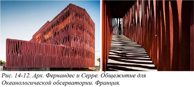 На юге Франции на берегу Средиземного моря было построено общежитие для сотрудников Океанологической обсерватории. Фасады шестиэтажного здания целиком скрыты за вторым не очень прозрачным фасадом, имитирующим коралловые полипы розово-охристого цвета (Рис. 14–12).