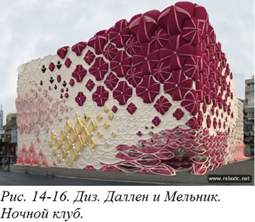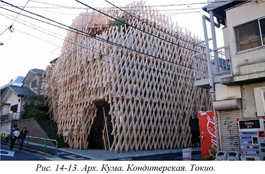 Именно такие «прорези» в архитектурной одежде можно увидеть в токийской трехэтажной кондитерской, буквально окутанной своего рода одеждой из сетчатого покрывала, «сотканного» из деревянных планок. В отдельных местах в деревянной сетке оставлены «прорези» – для входа и для небольшого балкона (Рис. 14–13).